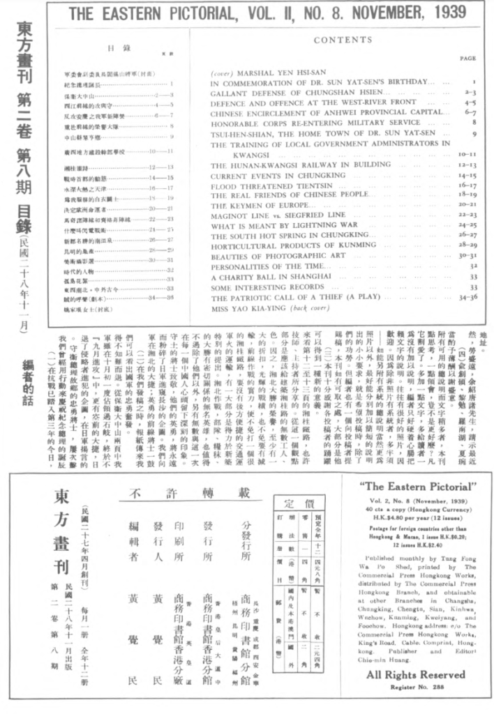 《东方画刊》是一份诞生于抗战烽火之中的综合性摄影月刊,于1938年4月在香港创刊,其核心宗旨是“将全民在时代前所表现的精神及其他一切活动,用真实的图片反映出来”,致力于成为抗战时期记录时代真实面貌的影像窗口。刊物初期由史谷尧担任主编兼发行人,随后自1939年4月起,发行人改为黄觉民,由黄觉民和裘芑香共同担任编辑,并由商务印书馆香港分馆负责发行工作。该刊聚集了包括沈逸千、王鸿文、孙明经、庄学本、黄剑豪、梁照杰、莫天侠、蒋仲琪等一批重要的撰稿人和摄影师。刊物的栏目设置紧密围绕战时局势和民生百态展开,主要设有战事照片、时事写真、阅者园地、战事美术作品、国际新闻等,其最大的特色是所有载文均采用中英文对照,极大地扩大了其海内外的影响力。在内容方面,《东方画刊》主要刊登中国军队抗战的照片,发布时事新闻图片,并转载最新的国际局势及新的科学发明照片。刊物并未局限于前线战火,也大量报道了后方社会的方方面面,如关系国计民生的纸、盐、桐油等物资的生产状况,战时学校的开课毕业,长沙市景,三峡风光,甚至有一页专门展示大画家刘海粟的近期作品,体现出它作为一份综合性画报的深度和广度。具体刊登的国内战事图片包括《童子军的救亡工作》、《征募寒衣游艺大会》、《服装表演筹震会》、《纪念九一八》、《沦陷后的平津现状》等,同时,也刊登了如《英国的民用防毒面具》、《荷女皇加冕四十周年大庆》、《捷克斯拉夫的独立》、《印度救护队》等外国消息,保持了其国际视野。此外,刊物还刊载了文学名家的作品,如欧阳予倩的《一年以来的编导生涯》、老舍的平剧《忠贤会》、茅盾的《铁怎样炼成钢》等,提升了刊物的文化品位。《东方画刊》不像那些临时性的战事画刊,它不仅报道前方,对后方生活的报道也丰富全面,成为研究抗战时期社会、文化和摄影艺术的珍贵史料,最终于1941年7月停刊。