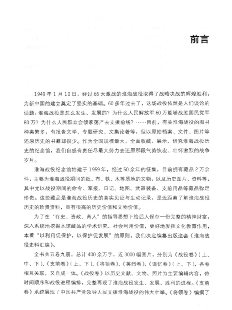 《淮海战役史料汇编》由淮海战役纪念馆编辑、国家图书馆出版社于2013 年出版,全书共分五卷九册,总计约四百余万字,配有近三千幅图片。它收录了有关 淮海战役(1948 年11 月-1949 年1 月)发生、发展与胜利的第一手文献资料。第一卷“战役卷”(上、中、下)按照时间顺序和战役进程编排,选录作战命令、总结报告、日记、家书、纵队小报等文献,展现战役全过程。第二卷“支前卷”(上、下)主要反映解放区支前工作的组织、动员与民工管理情况。第三卷“将领卷”收录国共双方及地方支前领导约二百余位将领的小传。第四卷“英烈卷”收录烈士三万余名的名录以及部分事迹与亲友回忆。第五卷“追忆卷”(上、下)以战争亲历者、亲友回忆与纪念设施为视角,展现战后记忆与纪念情况。编选过程中资料主要来源于纪念馆馆藏档案,包括原始命令、报导、照片等,许多为首次公开。该套汇编以史料原貌呈现为原则,没有对资料进行系统性史论加工,适合作为研究淮海战役、解放战争时期军事、政治、社会动员与战后纪念的重要文献工具。