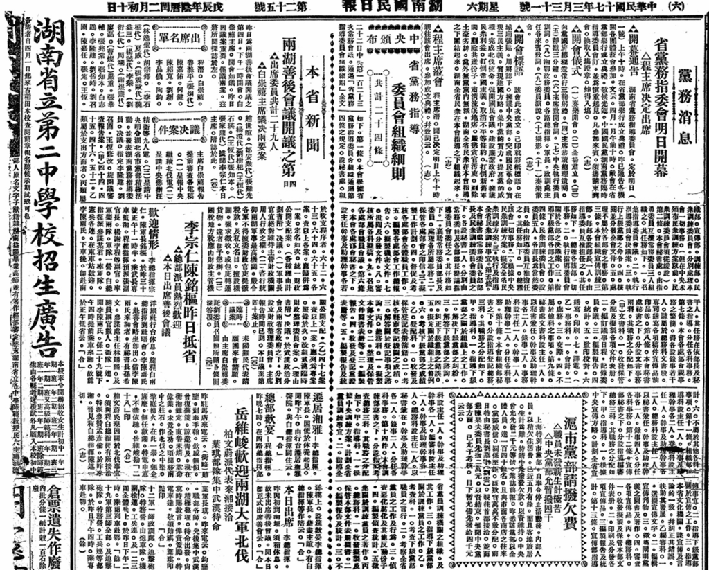 湖南国民日报 创刊于 1928 年3 月 5 日,初期由 湘鄂临时政务委员会 主办,同时接受 中国国民党湖南省党部 的指导,报社设在湖南长沙皇仓坪 42 号。该报记者称其为湖南省政府机关报兼国民党党报性质,开设社论、国际新闻、国内新闻、本省新闻、党务新闻、各县新闻等栏目,其党务报道尤具特色。在当时的历史语境下,它既起到政府宣传的职责,也承担党部的舆论功能,为湖南省乃至中部地区政界、社会和文化提供信息平台。报纸一直持续出版至 1949,其后被湖南日报社接收或整合为新类型的地方党报。虽然报纸所属时代已远,但其作为民国时期湖南新闻传播的重要载体,其内容反映了湖南省在抗战、政权更迭、社会变革年代中的地方政治、舆论走向与文化生态,具有相当的史料价值。